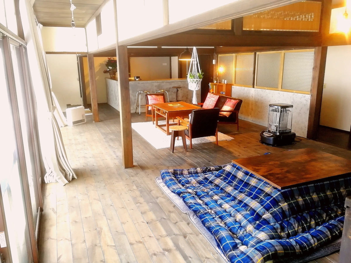 Renovated to be open, modern and spacious our chalet is only 20 minutes drive from Nagano City, Togakushi and Iizuna ski resorts. It is less than 5 minutes walk to many cafes and restaurants and the new Nagano Forest Village. There, you can buy local produce, craft beers & wine, and walk around the beautiful area. We recommend driving to explore more around the highlands and snow tires (or chains) are a must have during winter.