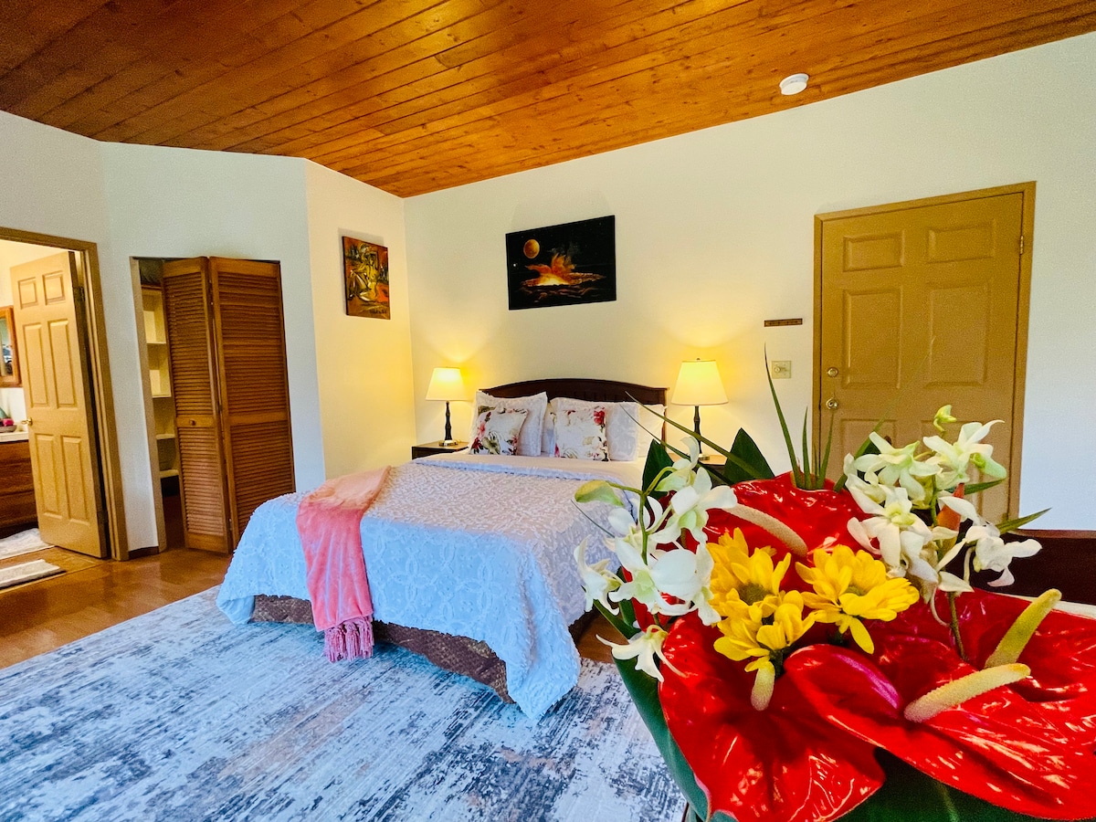 Enjoy the peaceful rainforest in the heart of Volcano Village and explore Hawaii Volcanoes National Park just a few minutes away. This is a 1,000 sq/ft (94 sq/m) master bedroom with a private entrance. The room has large windows and double french doors that open to the lush green scenery outside. The property is secured by entry gate and there is dedicated guest parking. We are also within walking distance of several restaurants, general stores, and the Sunday farmers market.