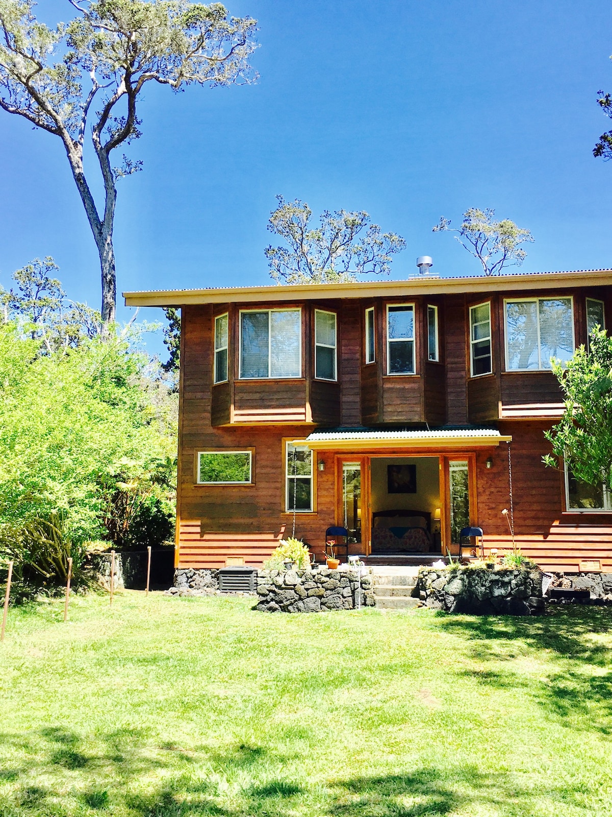Welcome to ❀Hale Lani - Heavenly House (FULLY LICENSED) We are nestled in 3 lush acres of natural Hawaiian Rain forest on the Big Island of Hawaii. Located only 8 miles from Volcano National Park. Enjoy the welcoming spirit of Aloha and let us host you in the style and comfort that you deserve. The Unique home has all the comforts of home yet it is paired with adventure and whimsy. A canopied Tree bed, indoor and outdoor showers, a soaker tub on the huge Lanai, and a swinging outdoor Daybed !
