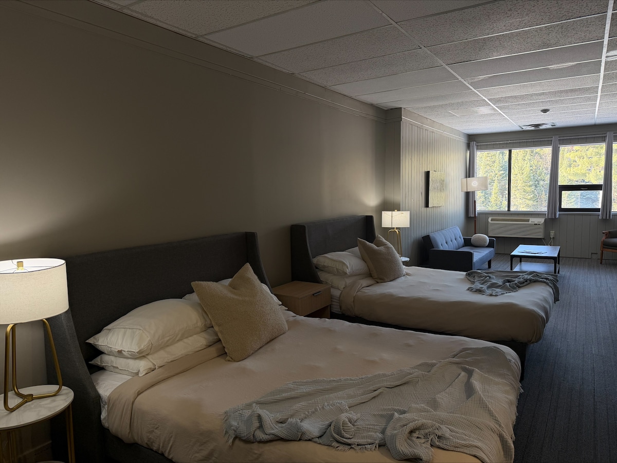This waterfront unit features a private patio and was newly renovated in spring 2025! Room Two is a one-bedroom unit with a two double beds, an accessible 3-piece luxury bathroom, and a kitchen with a full-size fridge, stovetop, microwave, coffee maker, and air conditioning. Enjoy a TV with satellite service, free Wi-Fi, and complimentary use of the picnic area and fire pit by the beautiful Madawaska River.