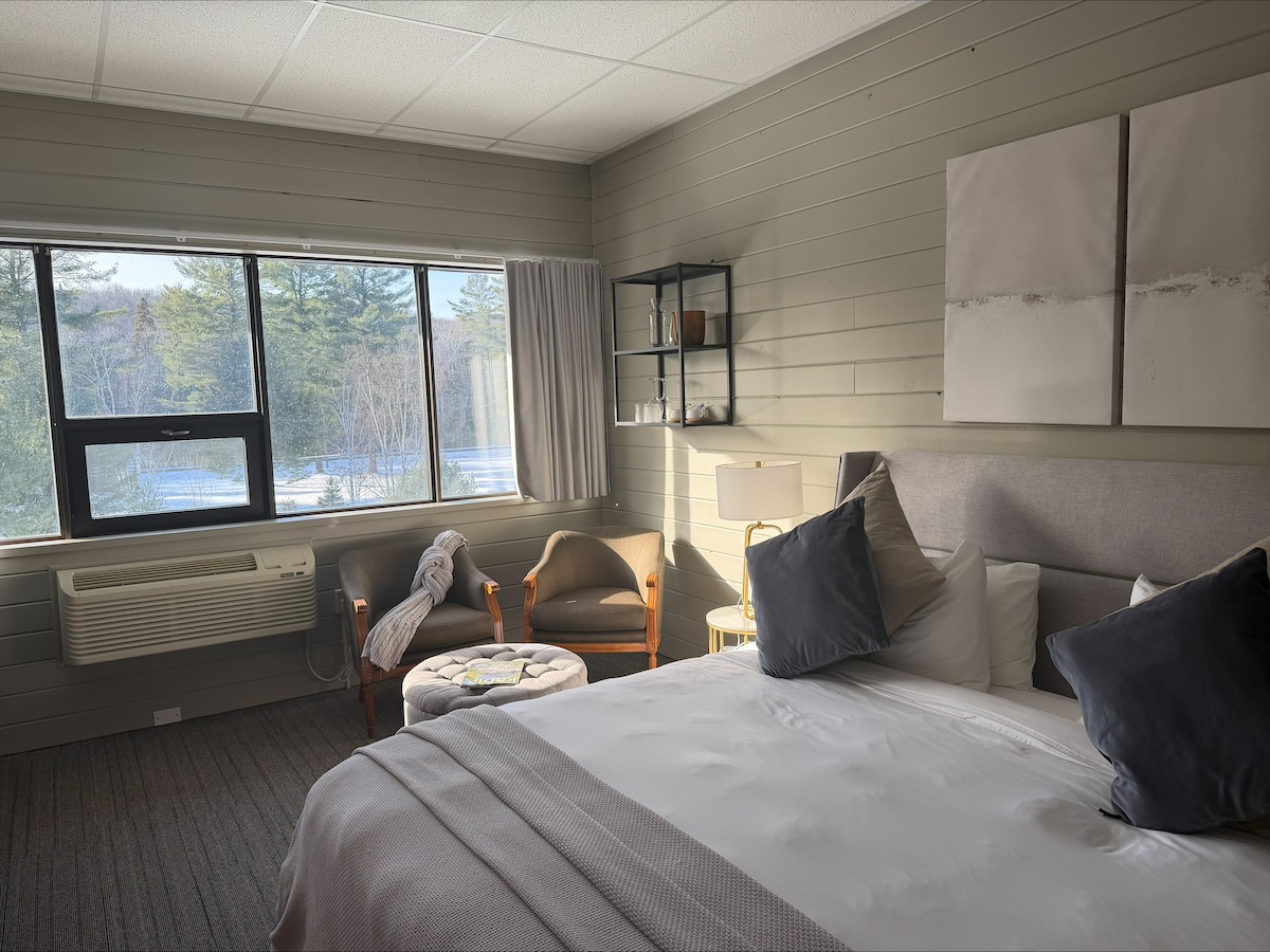 Newly renovated Room Eleven, features 1 King bed, a private 3-piece bathroom, and a large screen TV, fridge, microwave, coffee maker, and heat/AC. It's now more accessible with grab bars, wider doors, and a barrier-free shower. Enjoy a worry-free stay in this thoughtfully designed room while experiencing the stunning scenery to the fullest from a patio facing the river.