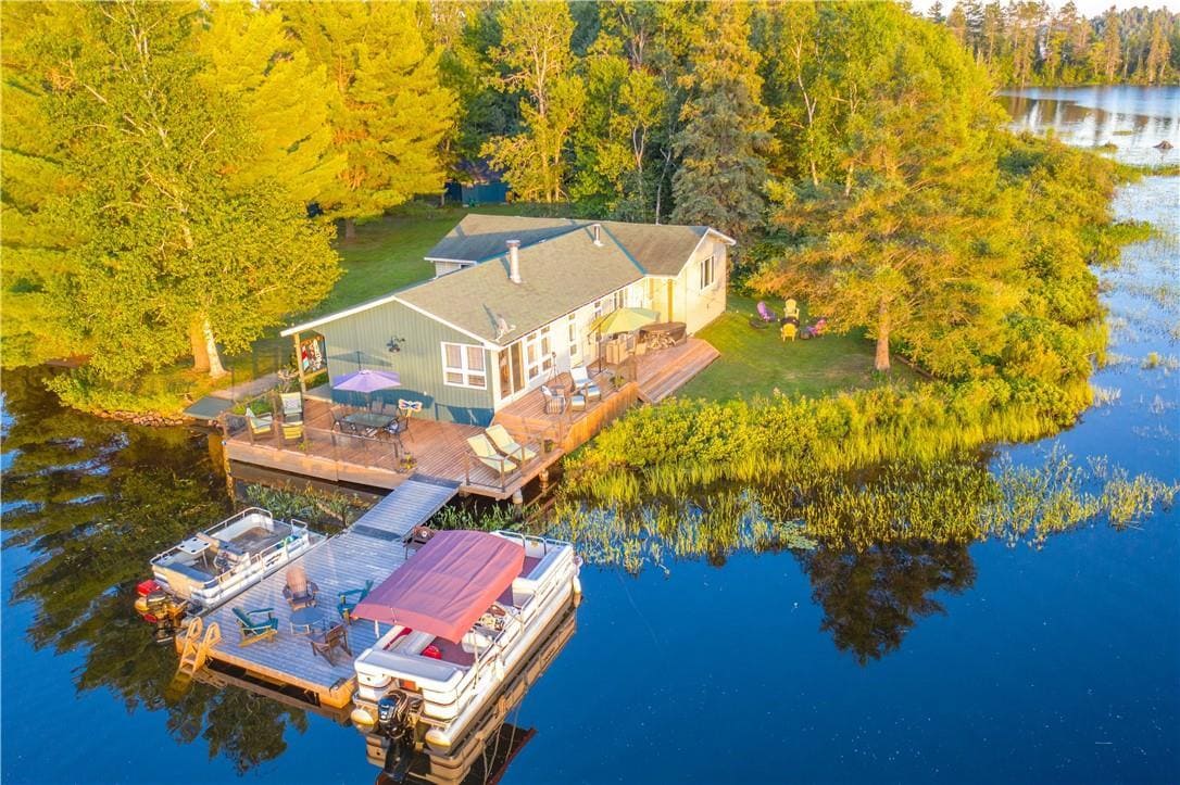 A comforting cottage on scenic West Lake, nestled between Haliburton and Fort Irwin. Enjoy a private setting with beautiful views and inviting spaces inside and out. Pine interiors, vaulted ceilings, a modern kitchen, and a spacious porch offer comfort and charm, while the large deck, dock system, sauna, and firepit area provide plenty of outdoor fun. S/W exposure 1,700 SQ.FT 250 ft lake frontage