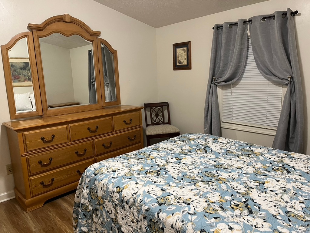 Quiet upstairs apartment, perfect for long term stays. Spacious rooms are above professional offices below, so your privacy and personal quiet space is ensured. King bed, two large dressers, additional seating and work area make this a terrific space for an individual or couple. Bathroom and dressing area is spacious, with dresser and large closet to make your long term stay feel more like home. Kitchenette includes under counter refrigerator, microwave and Keurig.