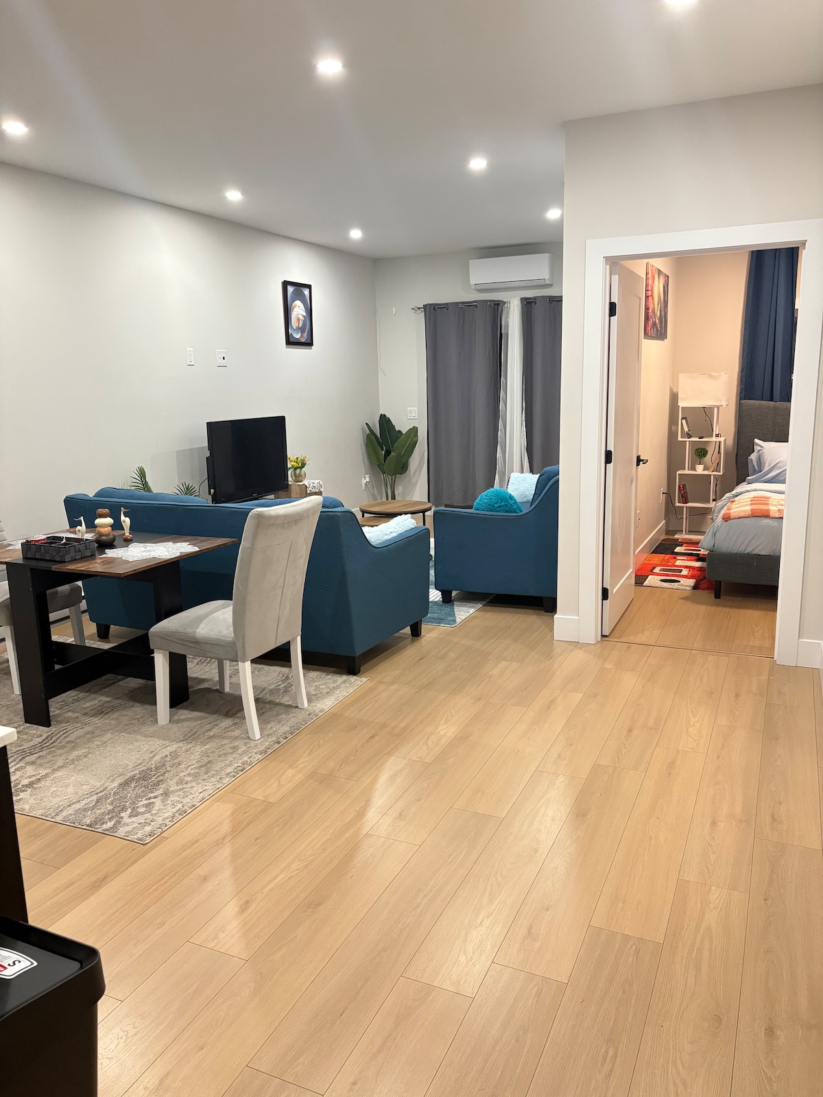 Welcome to our bright and spacious above-ground basement unit! This private two-bedroom, two-bath suite features comfy queen and double beds, a kitchenette with essentials (no stove), a pool table, and laundry. Enjoy the backyard seating area and year-round comfort with a heat pump. Located in a quiet neighborhood, just a 5-minute drive to restaurants, grocery stores, and shops.