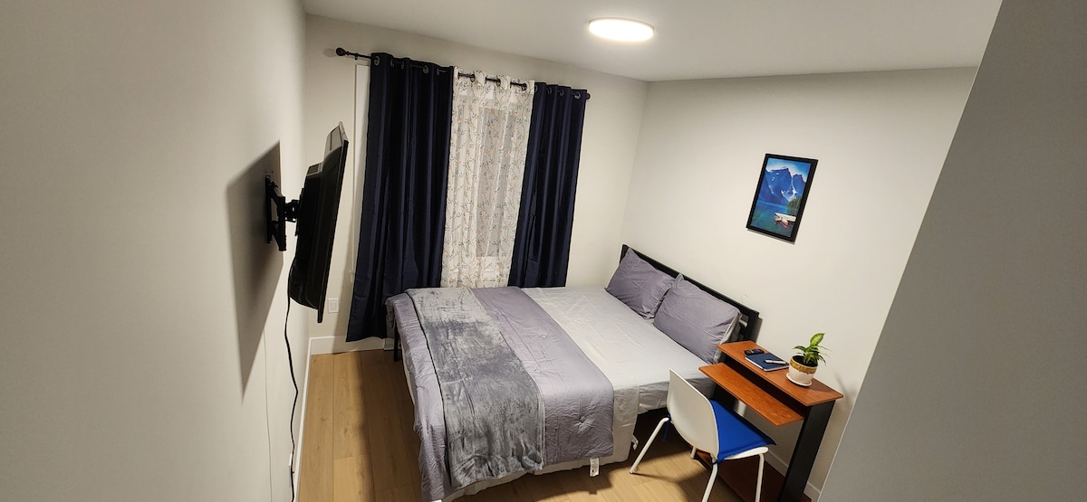 A bright and sunny south facing second level flat, conveniently located to downtown Halifax. Dal, SMU and hospitals, 10-15 min walking distance. King size bed. (option of 2 single beds on request for longer stays). Washer/Dryer Private bath with tub and shower Kitchenette : Double Sink - Microwave- Fridge- Hot-Plate, Air fryer, coffee maker for ground coffee. AC/ Heat Pump Roku TV available for personal apps.