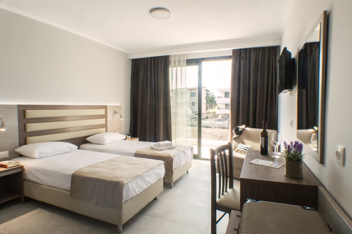 Situated in traditional Pefkohori village at the first “leg” of renowned Halkidiki peninsula, Valery Apartments is a newly built property, devoted to those, who cares about privacy and tranquility, but at the same time strives to be at the heart of boisterous resort lifestyle. Commitment to comfort is another advantage of this cozy inn, that’s why each of our two-level apartments features complete range of modern amenities, called to ensure you have seamless and unforgettable holidays in Greece.