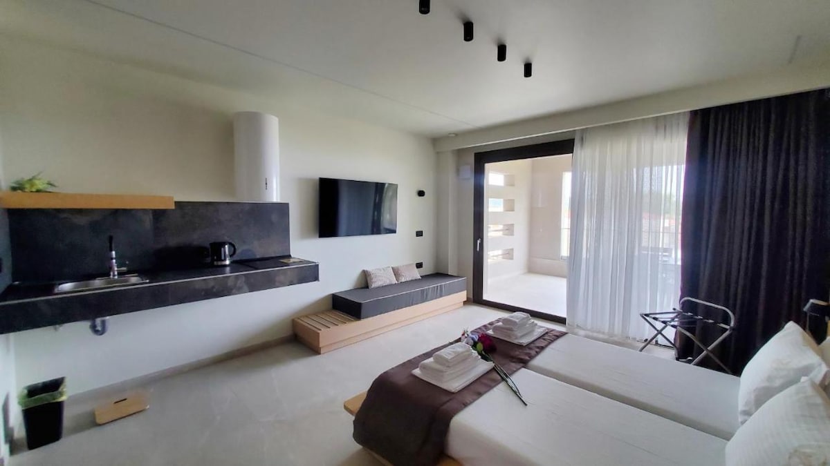 Our Junior Suite with 1 Double Bed and 1 Sofa Bed at HP Family Suites is ideal for small families or groups. The suite features elegant design with a double bed, high-quality wooden furnishings, and a comfortable sofa bed. Enjoy stunning sea views from the spacious balcony and a private bathroom with a contemporary shower. This suite perfectly blends luxury and practicality.