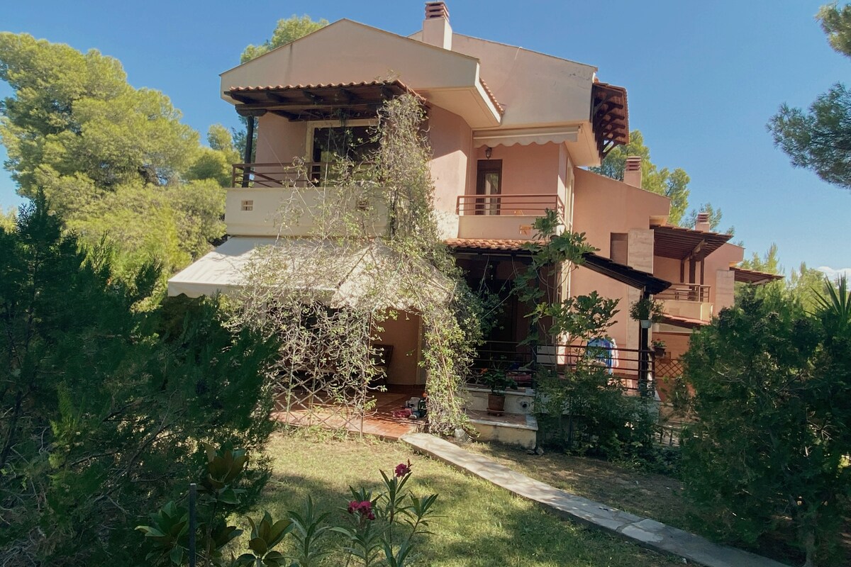 Beautiful Villa, with three bedrooms and spacious terrace,backyard and living room for 9 people. It belongs to the private village of ELANI at Kasandra peninsula of Halkidiki.Surrounded by pine trees in a magnificent and quiet environment. Only 100m away from the beach. It's the perfect place for family vacations. Crystal clear, shallow water, private beach,with a Greek Tavern and a beach bar with sun beds and umbrellas. Only 3 k/m away from the village of Siviri, with s/market and shops.
