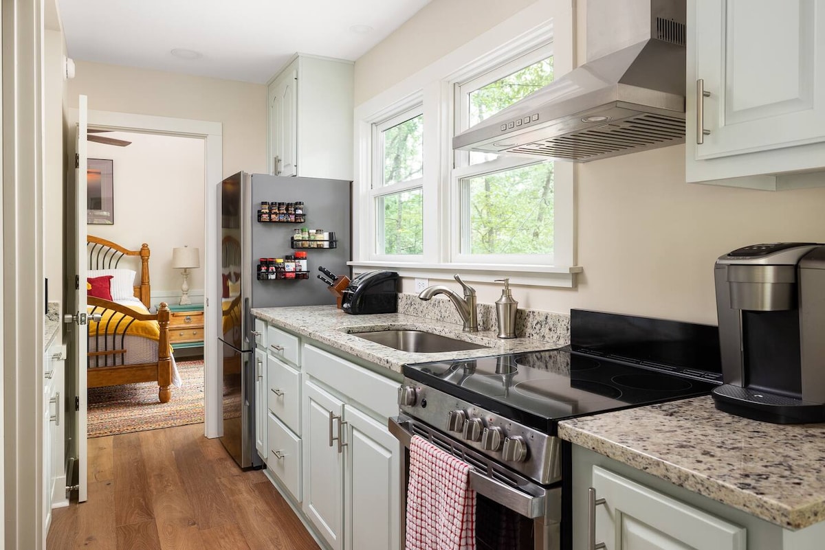 Glass infused bungalow invites nature in, nestled in a forest & 10 mins to Dahlonega. QUEEN size beds w/pillow top mattress, luxury bedding. Tongue & groove ceiling w/slate fireplace, fire pit, Bath w/slate shower, plush towels. Stainless steel kitchen appliances, glass cook-top, oven, dishwasher, microwave, toaster oven, fridge, utensils, cookware & Keurig. Our outdoor patio with grill awaits you.43″ HDTV ROKU's equipped w/Disney, Hulu, Max, Netflix, Paramount. Short Term Rental Lic#4829