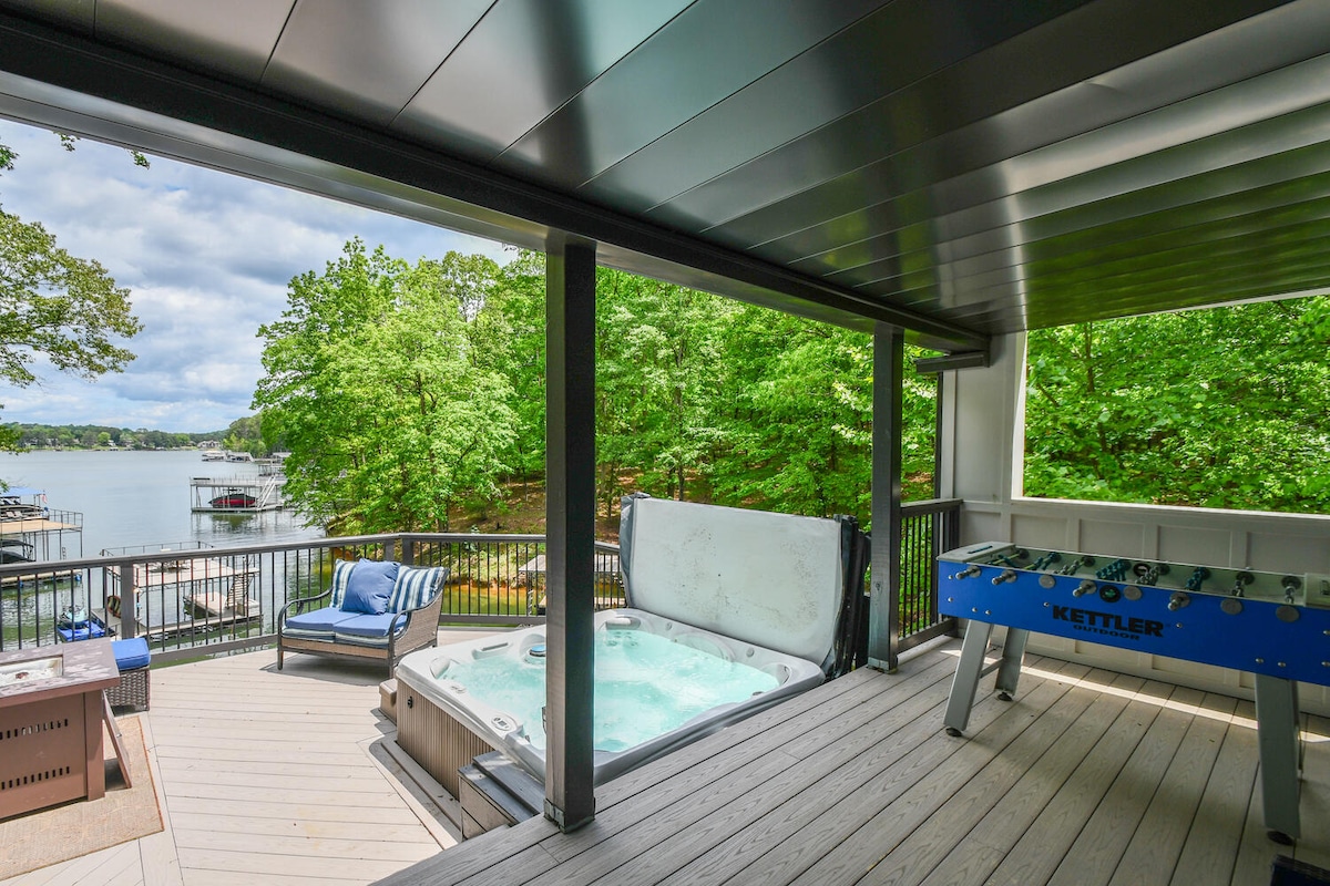 Think cabin meets lake house. Come enjoy a private jacuzzi surrounded by forest, or relax on the party dock overlooking a perfect sunset. If you're the outdoor type, enjoy a swim or boat ride on the calm Northern Lake Lanier waters or spend the day fishing. We have a Big Green Egg, a firepit, and plenty of kid toys. This immaculate luxury 3-bedroom, 2.5-bath home features luxury finishes & is fully equipped. It is set up as a true second home, not a bare-min airbnb rental