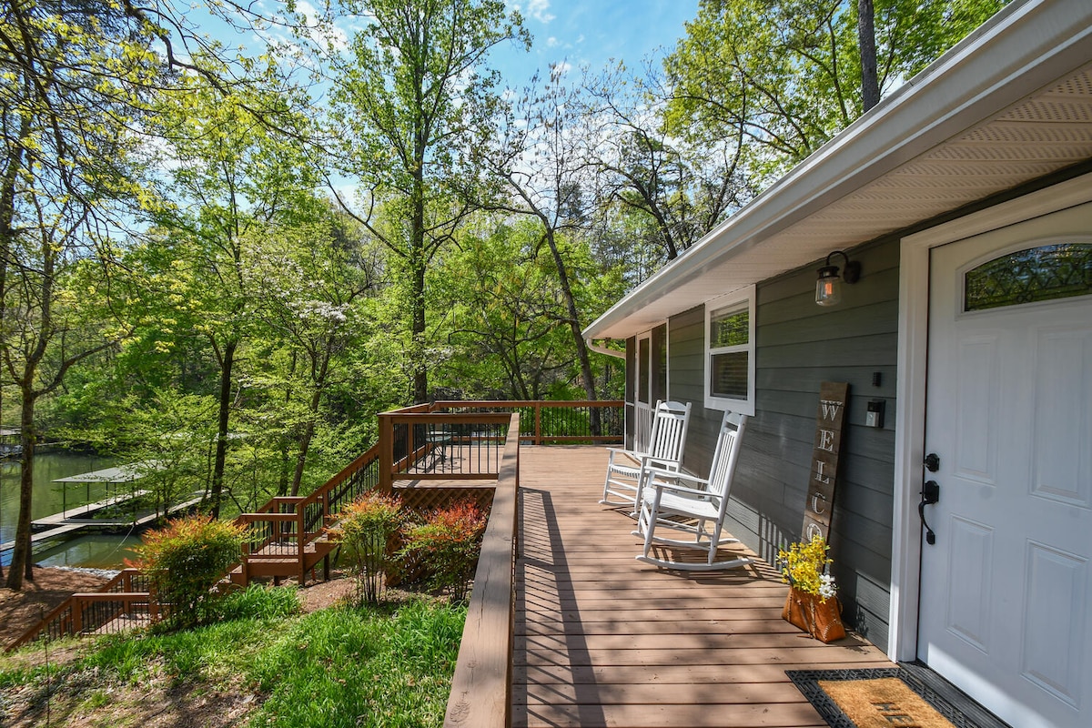 Think cabin meets lake house. Come enjoy a private jacuzzi surrounded by forest, or relax on the party dock overlooking a perfect sunset. If you're the outdoor type, enjoy a swim or boat ride on the calm Northern Lake Lanier waters or spend the day fishing. We have a Big Green Egg, a firepit, and plenty of kid toys. This immaculate luxury 3-bedroom, 2.5-bath home features luxury finishes & is fully equipped. It is set up as a true second home, not a bare-min airbnb rental