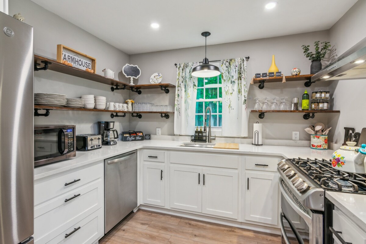Peach 🍑 Perfect, with a pinch of posh! Charming 3 bed, 2 bath farmhouse. 12 minutes to the historic Dahlonega Square and 5 minutes to the N. Georgia Outlet Mall. Enjoy the 2 acre property, with private firepit . Master includes King bed with ensuite bathroom. 2 bedrooms upstairs with shared full bath. Prime location with easy access to shopping, restaurants, wineries, and hiking excursions in both Dawsonville and Dahlonega. With over 375 reviews, this N. Georgia Airbnb is ‘just Peachy! 🍑