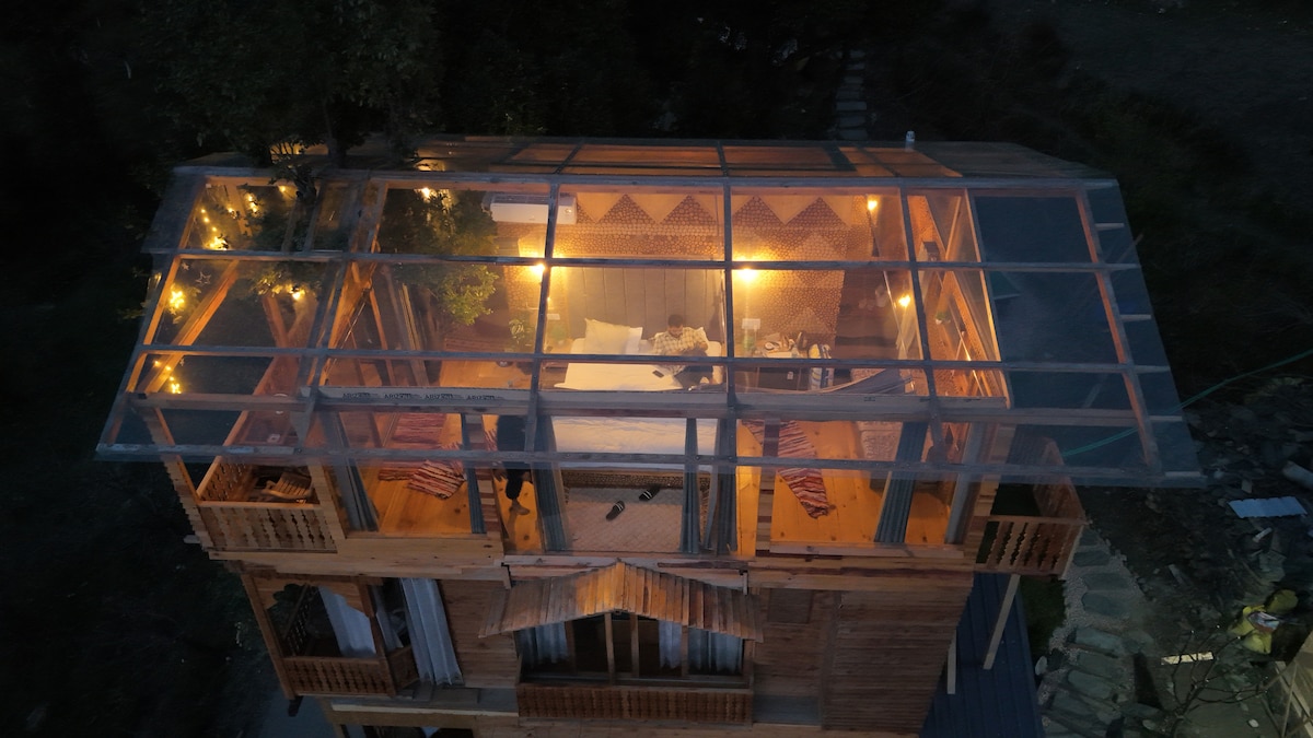 Welcome to our fairytale 'Evara' – meaning 'gift of God.' Nestled in the tranquil village of Naggar. Evara is a beautifully crafted wooden duplex cottage offering peace, comfort, and stunning mountain views. Surrounded by lush apple orchards and nature's quiet charm. This serene getaway features balconies on three sides, allowing you to soak in breathtaking vistas from sunrise to sunset. Warm & cozy interiors, a full kitchen, and a luxurious Jacuzzi to unwind after a day of exploring.