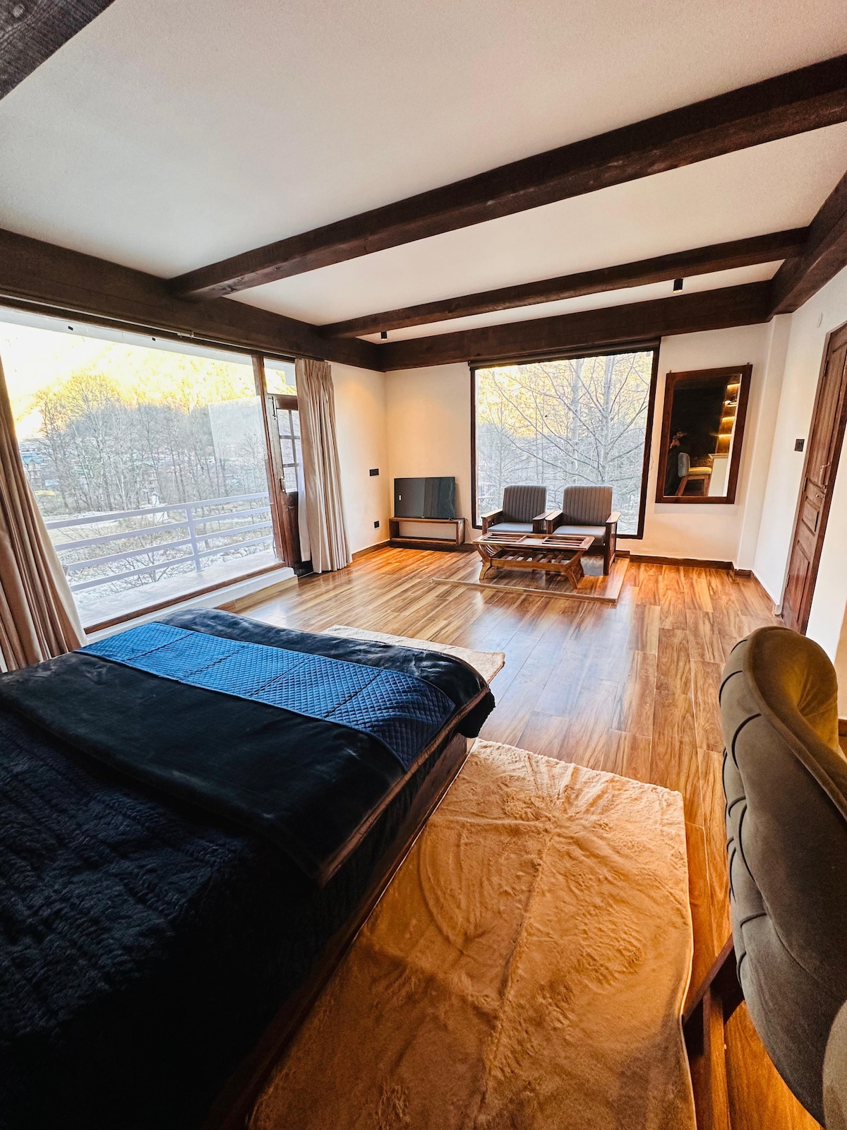 H₂O: Luxe by the River – Luxury Riverside Studio Apartments | Manali | 1st/Middle Floor Stunning luxury studio apartments set beside a serene river with breathtaking mountain views. Warm wooden interiors, stone walls, plush beds, elegant lighting, a stylish bar and kitchenette create the perfect blend of comfort and sophistication. Ideal for couples, honeymooners and premium travellers seeking a peaceful yet luxurious Manali escape.
