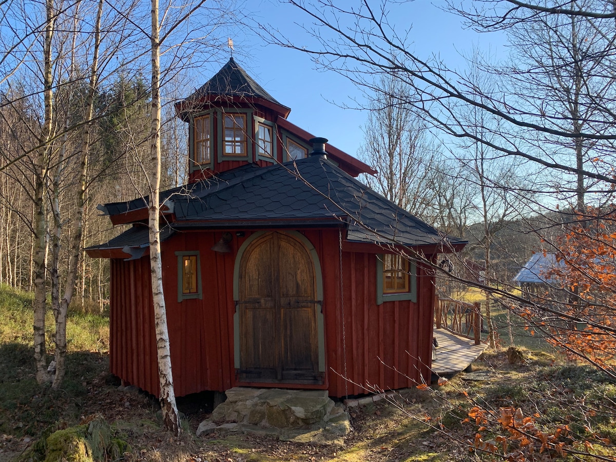 I blåbärsskogen ligger det lilla, lilla katthuset med inga rakar vinklar. Katthuset erbjuder lugn och ro och skydd från regn och rusk. Du/ ni sover i en utfällbar säng ( 140 cm ) med rena sängkläder. Sängen är en låg säng (25 cm hög). I Katthuset finns vattenkokare, värme och torn.Eget utedass och utedusch intill. Möjlighet finns att köpa till en enklare frukost att äta i huset, på verandan eller alternativt i Drakhuset. Boendet ligger en mil från Ullared med det stora varuhuset Gekås.