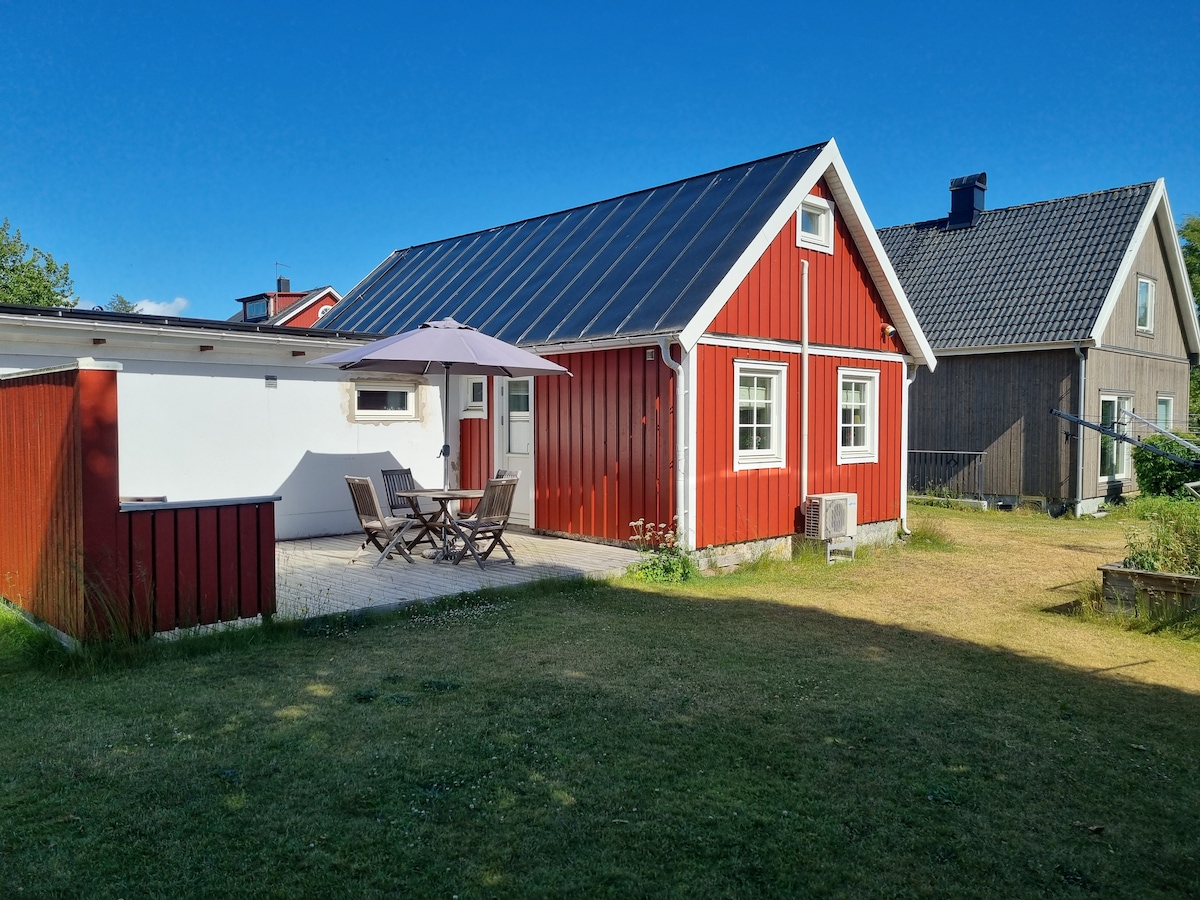 Välkommen till Smedjan! En modern stuga i funkisstil som tidigare varit smedja till gårdshuset. 45 väldisponerade kvadratmeter plus 18 kvm sovloft med begränsad takhöjd och 4 sängar 3,6m takhöjd på nedervåning Stora fönster med ostörd havsutsikt 2 sängar i eget sovrum på entreplan Luftkonditionering 30kvm egen terrass med möbler och grill Stor gräsmatta tillgänglig framför huset Stor soffa med tv Wifi Badrum med dusch, wc samt tvättmaskin