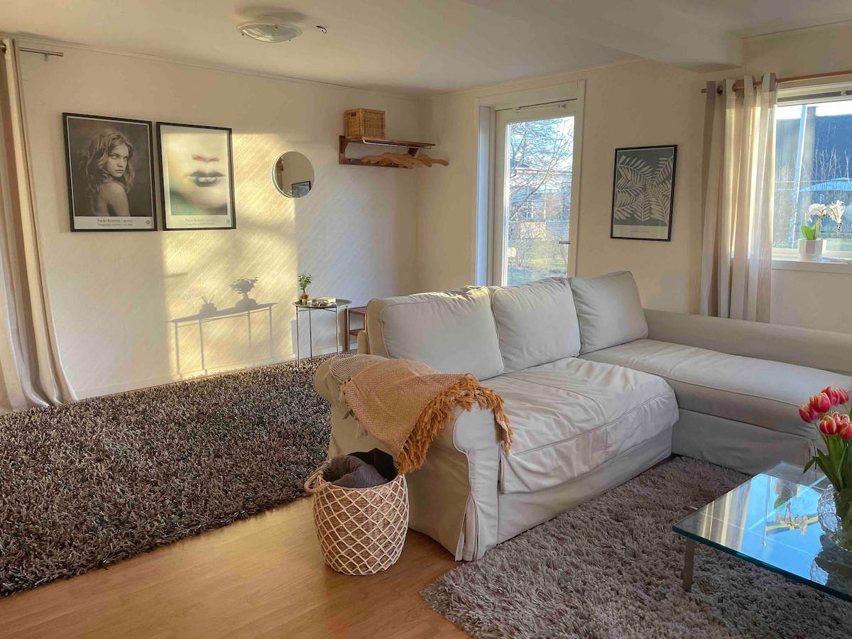 One bedroom downstairs w double bed and new added attic bedroom with one double bed and one bed that also functions as a sofa. Outdoor space with unobstructed sea view and outdoor furniture. From the apartment you can view the sea and walk about 100 meters down to the ocean. 5 minutes away walking by the ocean you get the beautiful sandy beach of Ranarpsstrand, which also hosts a tennis field and a pool.