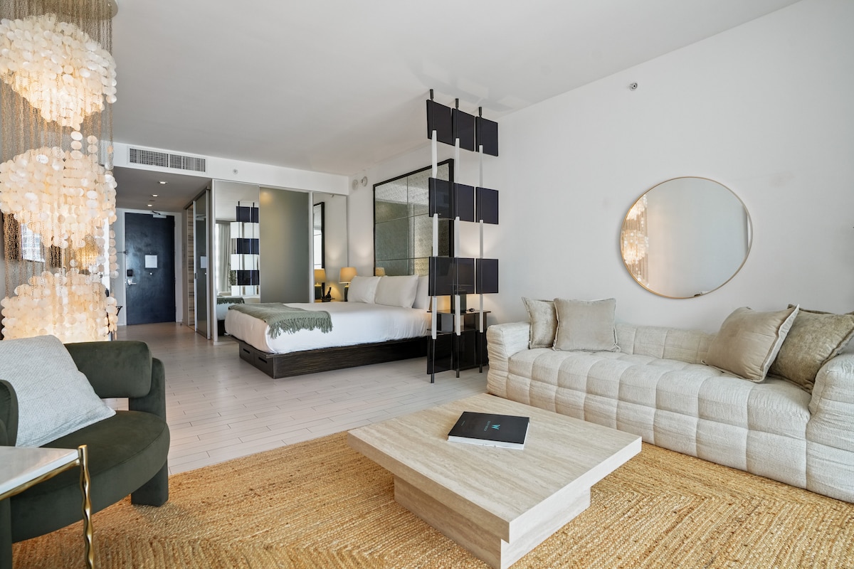 Welcome to Pure Miami Beach! Escape to this modern beachfront studio in sunny Miami Beach, Florida, with breathtaking 180° ocean views. Relax in a plush king-size bed, stream on a 65” 4K Samsung TV, or work with private 300mb WiFi and ethernet connections. Stay fit in the renovated gym, then unwind by the sparkling pool with direct beach access, lounge chairs, and a tiki bar for tropical drinks and bites. Free parking, luxury finishes, and endless ocean vibes make this the ultimate getaway!