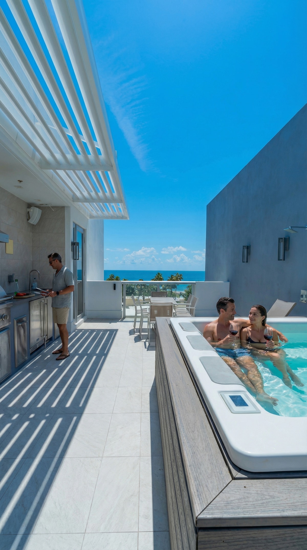 Hollywood Florida oceanfront condo on the 38th floor with panoramic views of the Atlantic Ocean and Intracoastal Waterway. Located on Ocean Drive near Miami & Fort Lauderdale attractions, this luxury stay is perfect for couples, families & digital nomads. Enjoy pools, gym, spa & private beach service. Relax on your oversized balcony and experience the best of Florida’s coast. Book your Hollywood FL escape today! 🌊✨