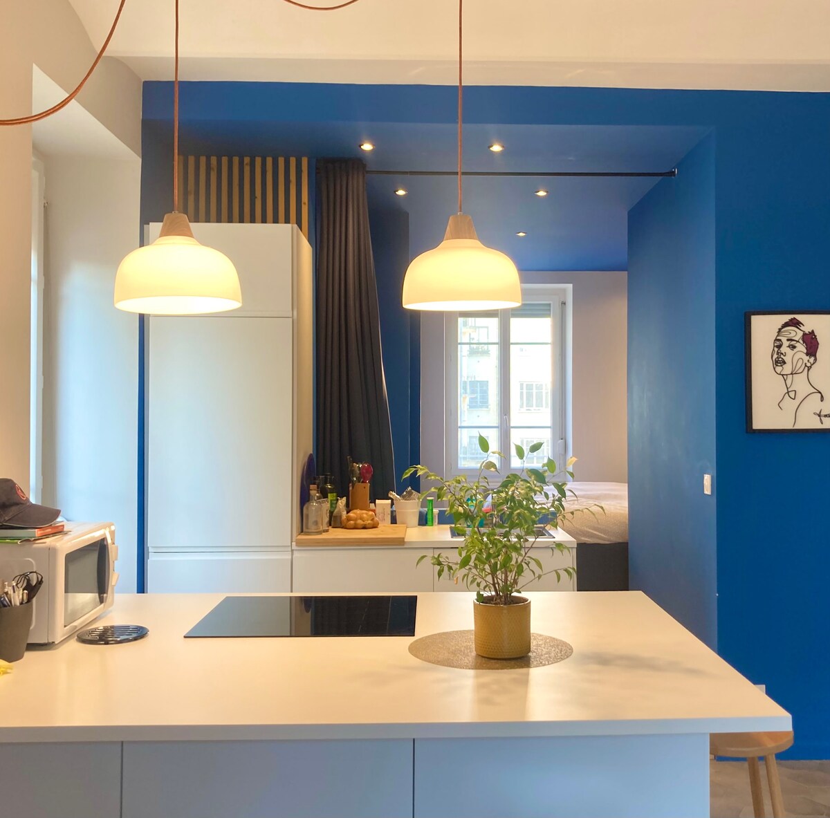 Proche restaurants, vie nocturne et transports en commun. Parfait pour couple et voyageur en solo. Location idéale pour visite studio 15M2 équipé : 1 seul clic-clac (120x190 DONC ATTENTION POUR LES GRANDES TAILLES MATELAS NEUF AU 07/2022 ) bureau, penderie, coin cuisine : plaque induction, réfrigérateur, micro onde bouilloire; table pliante 60x60 sèche cheveux 2 serviettes, torchon cuisine ,DRAPS COUETTE OREILLERS Produit vaisselle, savon liquide mains, gel douche; shampoing THE CAFE