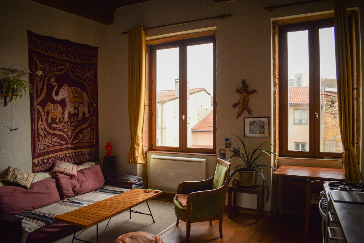 Authentique canut de 250 ans, cœur Croix-Rousse, cosy & calme. Plongez dans l'histoire d'un immeuble lyonnais du XVIIIe siècle. Ce canut aux pierres apparentes et plafond lyonnais offre une ambiance chaleureuse, baignée de lumière plein sud. La pièce de vie réunit un salon, une cuisine équipée et un coin bureau dédié avec wifi fibre rapide – idéal pour télétravail ou séminaires. À 1 mn du métro, vous êtes entouré de marchés, bouchons et boutiques, tout en profitant d'un calme absolu la nuit.