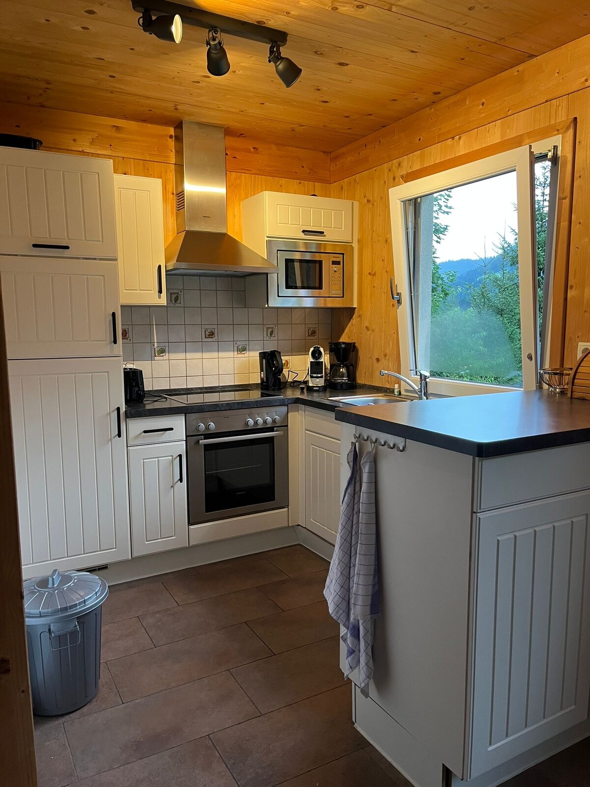Eine Dusche sowie eine extra Waschmöglichkeit sind integriert. Das besondere Schmuckstück ist unsere Sauna, die sich ebenfalls auf dieser Ebene befindet. Auch eine Kochecke mit kleinem Küchenschrank, einer Kochplatte, und den wichtigsten Utensilien stehen für Sie bereit. Gehen Sie ein paar Schritte hinters Haus wartet eine schöne Terrasse für gemütliche, laue Abende auf Sie. Eine Treppe führt hinunter zum Bach. Im oberen Bereich befindet sich das Schlafzimmer mit Doppelbett sowie dem Gästebett.