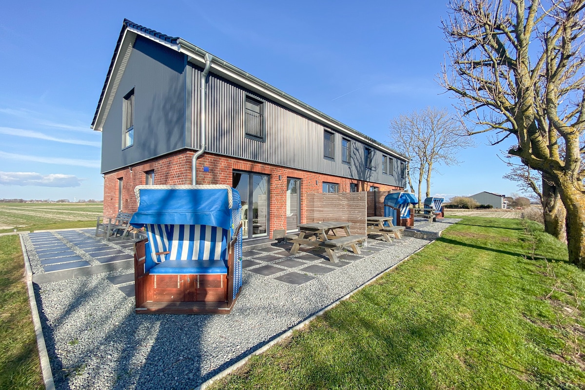 Kleines, neugebautes, reetgedecktes Haus auf der Bahnenswarft in Fahretoft freut sich auf Gäste mit und ohne Hund. Kuschelige 60m2 halten eine Menge Gemütlichkeit für euch bereit. Ob eingezäunter Garten (1,20m hoch), Faßsauna, Badewanne oder Badetonne - die ein oder andere Möglichkeit ganz entspannt durch den Urlaub zu surfen ist gegeben.