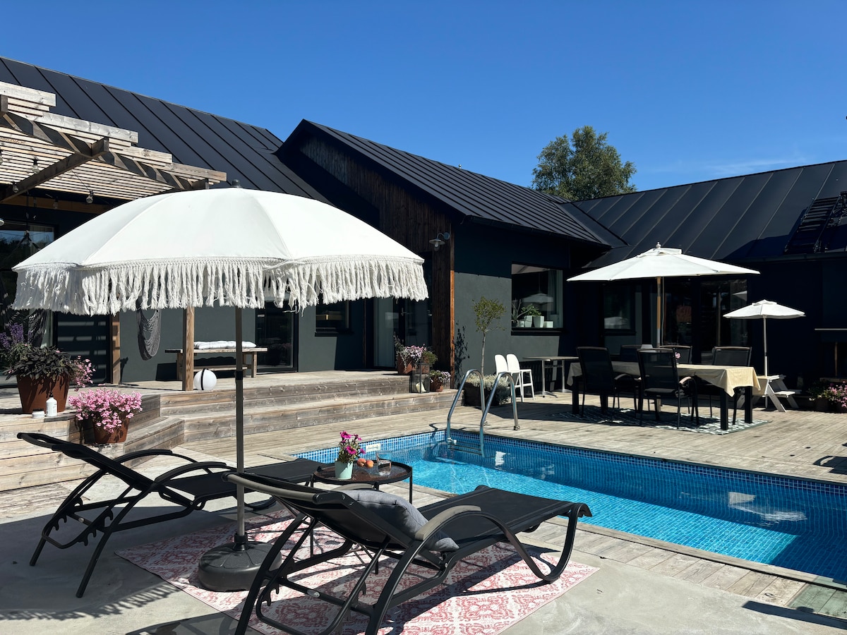 Only a 10 minute walk from central Båstad you will find this summer paradise with magnificent views and a gorgeous pool and terraces in many directions with no disturbing neighbors close. Your own creek will keep you calm together with the yoga house in the middle of the parklike huge parcel. With three main bedrooms, two living rooms with a fireplace and a guest cabin you can fit 10 people here. Though an old house, it is very modern with all amenities you need for your stay.