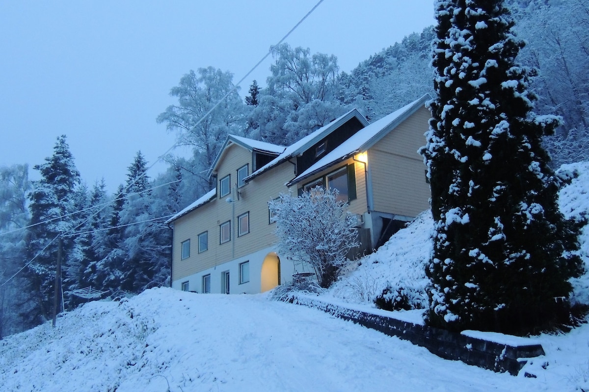 Leiligheten ligger i sokkeletasjen og har 3 soverom, bad, godt utstyrt kjøkken og vaskerom med vaskemaskin og tørketrommel som kan brukes uten ekstra kostnader. Største soverommet har en stor dobbeltseng, 2 andre soverom har enkel seng. Stua har sovesofa. Sengetøy, håndklær og vaskeartikler er inkludert i prisen. Det er gode gratis parkeringsmuligheter på stedet. Rabatt ved ukes opphold. God WIFI på stedet. NB! Ved allergi: det bor 2 katter og en hund på eiendommen.