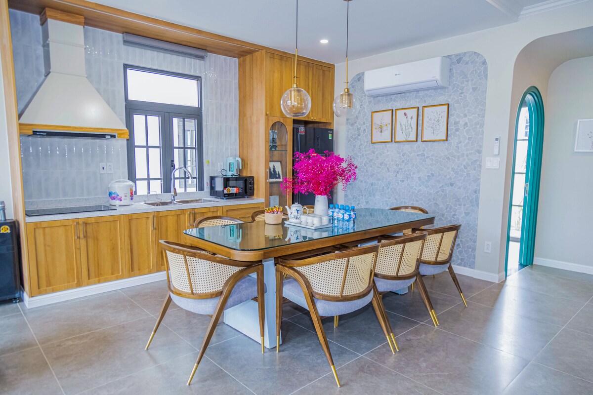 - Single villa located at Novaworld Phan Thiet with an area of 200m2. - There is 1 kitchen, 3 beds, 2 bedrooms, 3 bathrooms with 2 extra mattresses (accommodates 6 adults and 2 children under 10 years old). - Located in the first row of apartments of Nova Phan Thiet, convenient to amenities such as infinity pool, Bikini Beach, Circus Land amusement park, Wonderland water park. - Free cooking, outdoor BBQ. - Cleaning services, speaker rental, and buying services are available.