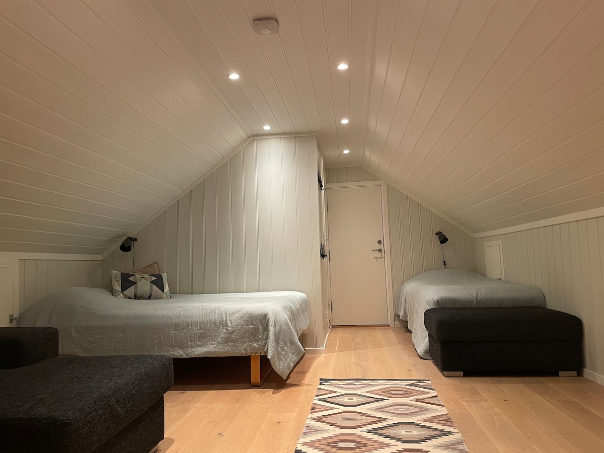 Apartment at Domkirkeodden, short walk to city center and beaches. Newly renovated house from 1920, featuring ventilation and heated floor. The apartment is 38 m² located on the lower ground floor, with a combined kitchen/living room, bedroom with double bed, bathroom with washer and dryer. TV with Netflix. Two additional beds are available in a separate 15 m² annex. Access to the backyard and a large rooftop terrace with stunning views can be arranged upon request. EV charging available.
