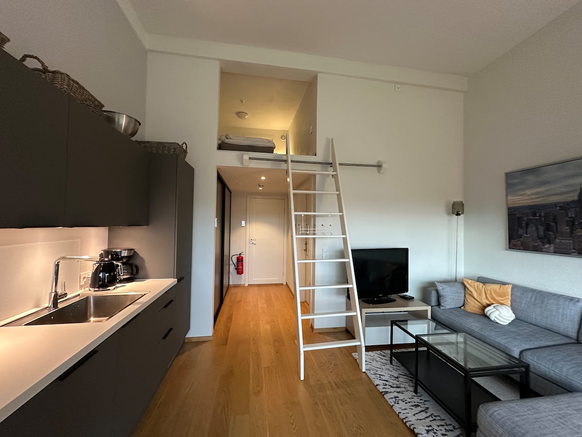 Godt utstyrt studioleilighet på ca. 25 m². Fint overnattingssted med egen inngang. 5 minutters gange til sentrum og universitetet. Inneholder oppholdsrom med tekjøkken og et flott bad. Lyst og hyggelig med god standard og sentral beliggenhet. Gratis parkering rett utenfor. Kjøkkenkrok med mikrobølgeovn, kjøleskap og kaffetrakter. 2 senger(Dobbel) på hems. Inkludert i pris er sengetøy og håndklær. Velkommen!