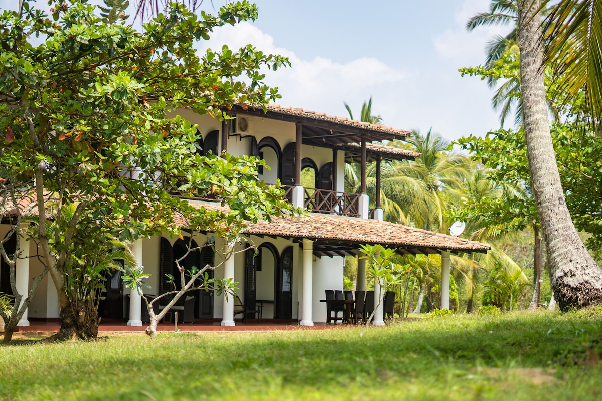 Kick back and relax in this calm, stylish Villa with Free breakfast and buttler provided free of charge in this colonial space with In house Spa facilities with a huge garden surrounded by peacocks with just a few steps to the Mawella beach in our own private road of just 100 meters and also provides breakfast if guest prefers for free with a permanent in house professional buttler.Sri Lanka Tourist Board Approved property. 15 minutes tuk tuk ride to HIRIKETIYA. 42'' Smart TV Available