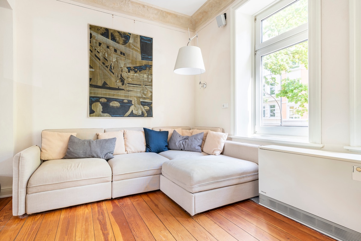 New opening 9/2020. Beautiful, sunny apartment in Waterloohus in quiet side street on the edge of the Schanzenviertel. Stay in an old merchant's villa built in 1885 and renovated in 2020 in a quiet residential street. Old building charm with modern hotel-like atmosphere, improved sound insulation and well-equipped kitchen. Within walking distance are numerous bars and restaurants of the popular trendy neighborhood Sternschanze. Child-friendly district with many playgrounds.