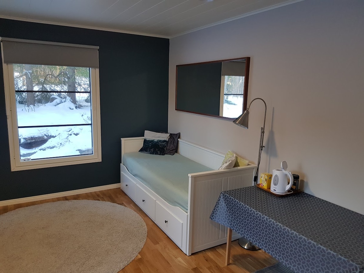 Vuokrataan sopuisan kokoinen vierasmaja Tuusulanjärven läheisyydestä, jossa majoittuu yksi henkilö kerrallaan. Kohde sijaitsee Tuusulan rantatien vieressä, josta Tuusulajärven nähtävyydet mm. Halosenniemi, Sibeliuksen Ainola, Aleksis Kiven mökki, Erkkola ja Krapin alue sekä lahjatavaraliike Marin putiikki kävelymatkan päässä. Yleiselle uimarannalle noin 400 m kävellen. Helsinki-Vantaan lentokentälle noin 20-25 min. ajomatka. Upeat ulkoilureitit lähellä! Lähimpään suureen ruokakauppaan 3,6 km.