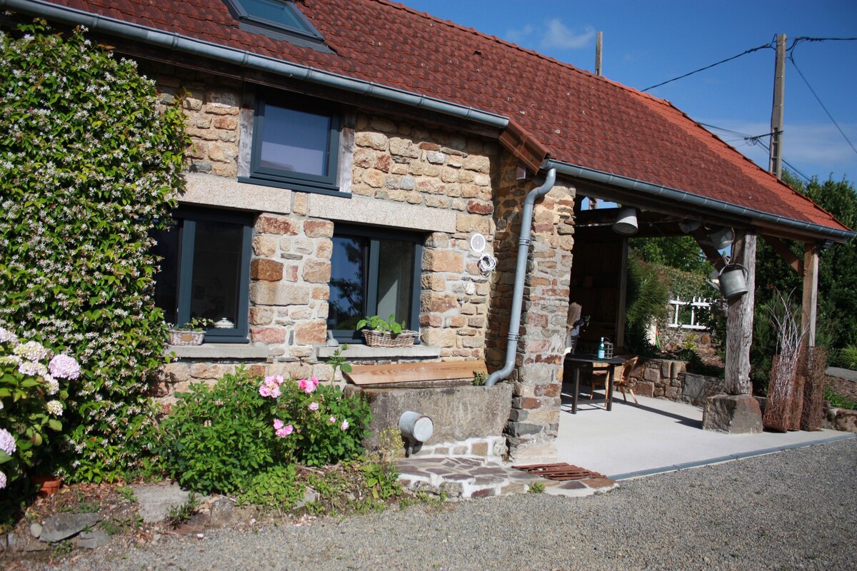 Chez Hélène - Gîtes en baie vous propose "la petite corbière": Charmante maison de pierre nichée dans le bocage de l'arrière pays de Jullouville, à 3km de la mer dans un environnement verdoyant et calme. La maison est composée d'un salon avec cheminée et poêle, d'une cuisine équipée, de deux chambres en enfilade et d'une salle de douche. Vous pourrez profiter de son grand et agréable jardin joliment arboré dans le calme de la campagne.
