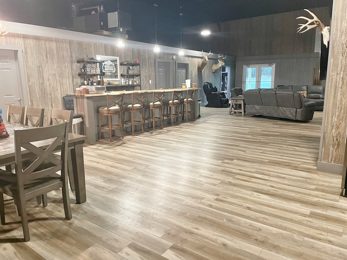 The Lodge is perfect, small town location for any large family or group. Spacious open concept living space with Smart TV and wifi. Fully stocked kitchen with dining table for 8 and bar height seating for 10. 5 bedroom, 3 bathroom, sleeps up to 18. 1 bedroom is a suite, queen bed and bath attached. 4 bedrooms have 2 full beds in each. Bar and Pool Table. Outdoor seating with fire pit. Plenty of room for the whole family!