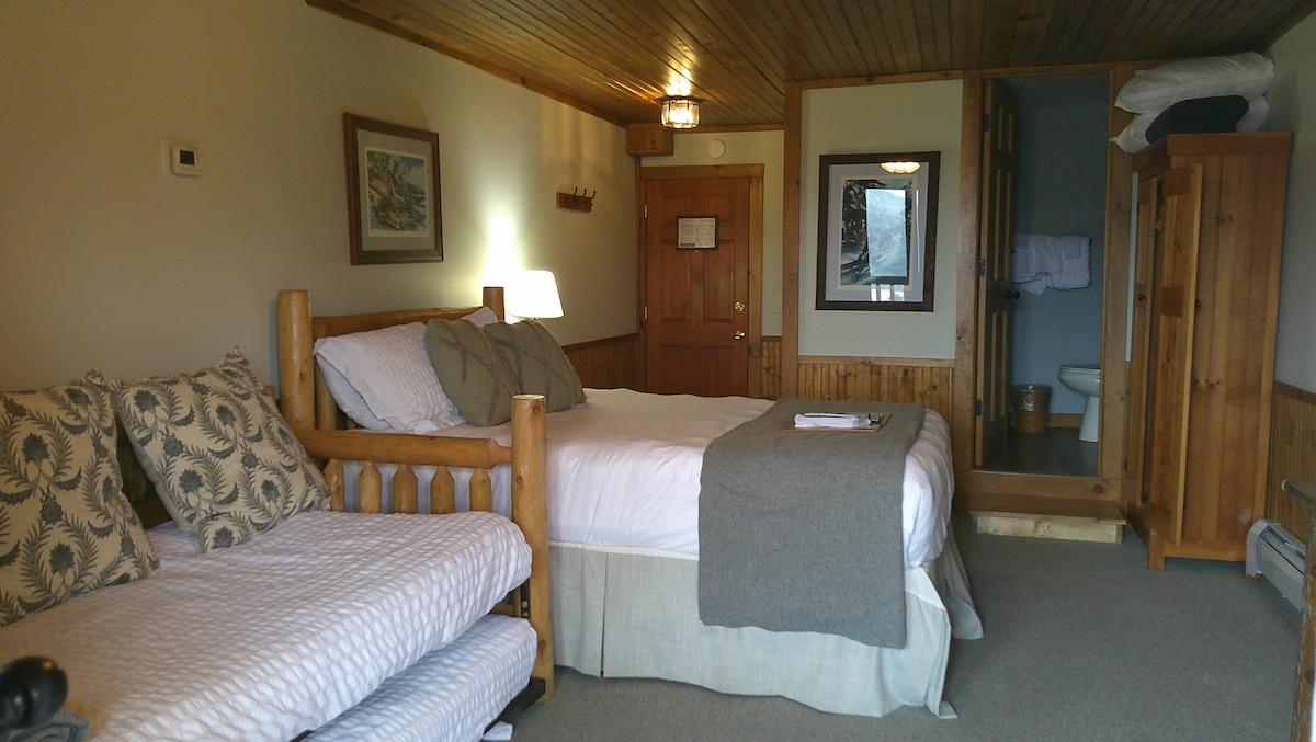 Located on the rear-facing side of the Log House, these rooms offer the same comfort and amenities as our balcony rooms minus the view. Enjoy newly renovated bathrooms with glass showers, white marble and rustic accents compliment the natural wood tones throughout the guest room. These rooms also have A/c and provide easy access to our main Lodge for dining, exceptional lake & mountain views, and so much more. Stairs are used to access this unit.