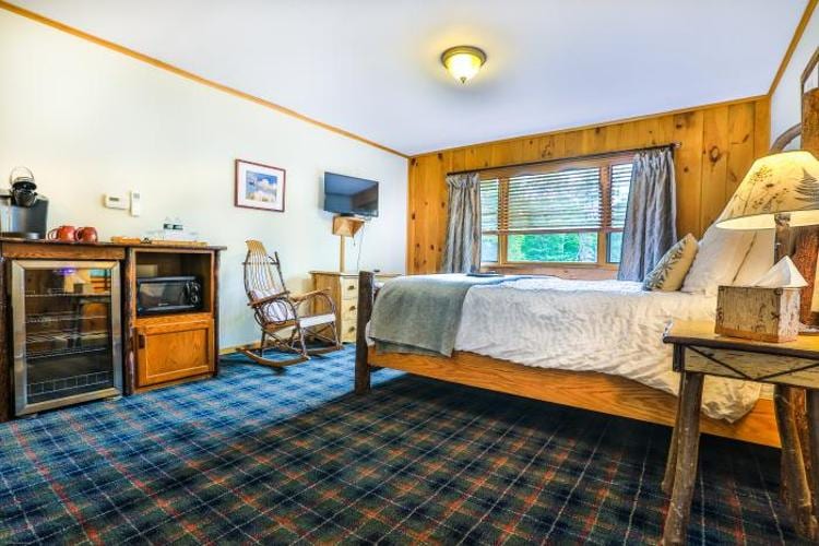 Located on the rear-facing side of the Log House, these rooms offer the same comfort and amenities as our balcony rooms minus the view. Enjoy newly renovated bathrooms with glass showers, white marble and rustic accents compliment the natural wood tones throughout the guest room. These rooms also have A/c and provide easy access to our main Lodge for dining, exceptional lake & mountain views, and so much more. Stairs are used to access this unit.