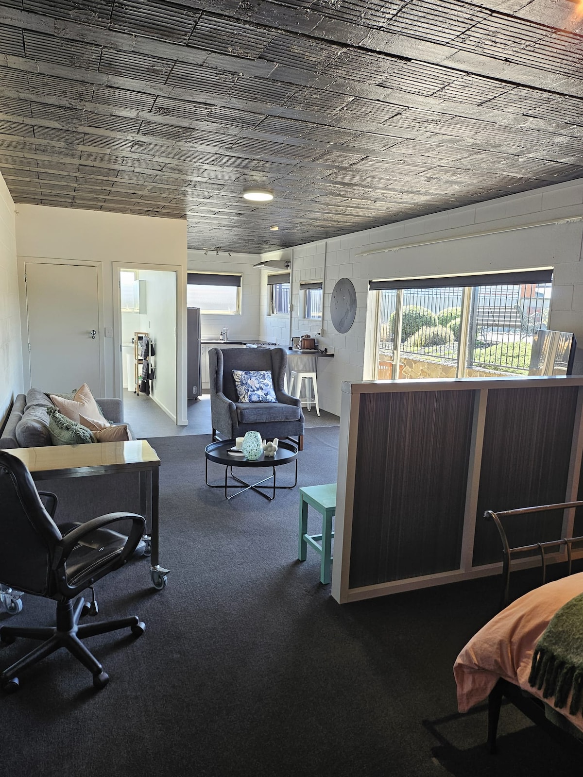 With your own private patio enjoy a peaceful stay in this modern centrally located 1 bedroom apartment with separate living and work space. You have your own kitchenette with refrigerator and microwave for heating food. Sleep well on the Deluxe Superior King size bed with quality linen and beautifully appointed tiled ensuite. Double sofa bed available for two extra guests if required. Free parking, Private Rd, Wifi, Netflix and YouTube. Airport approximately 12 km South of Lakeside.