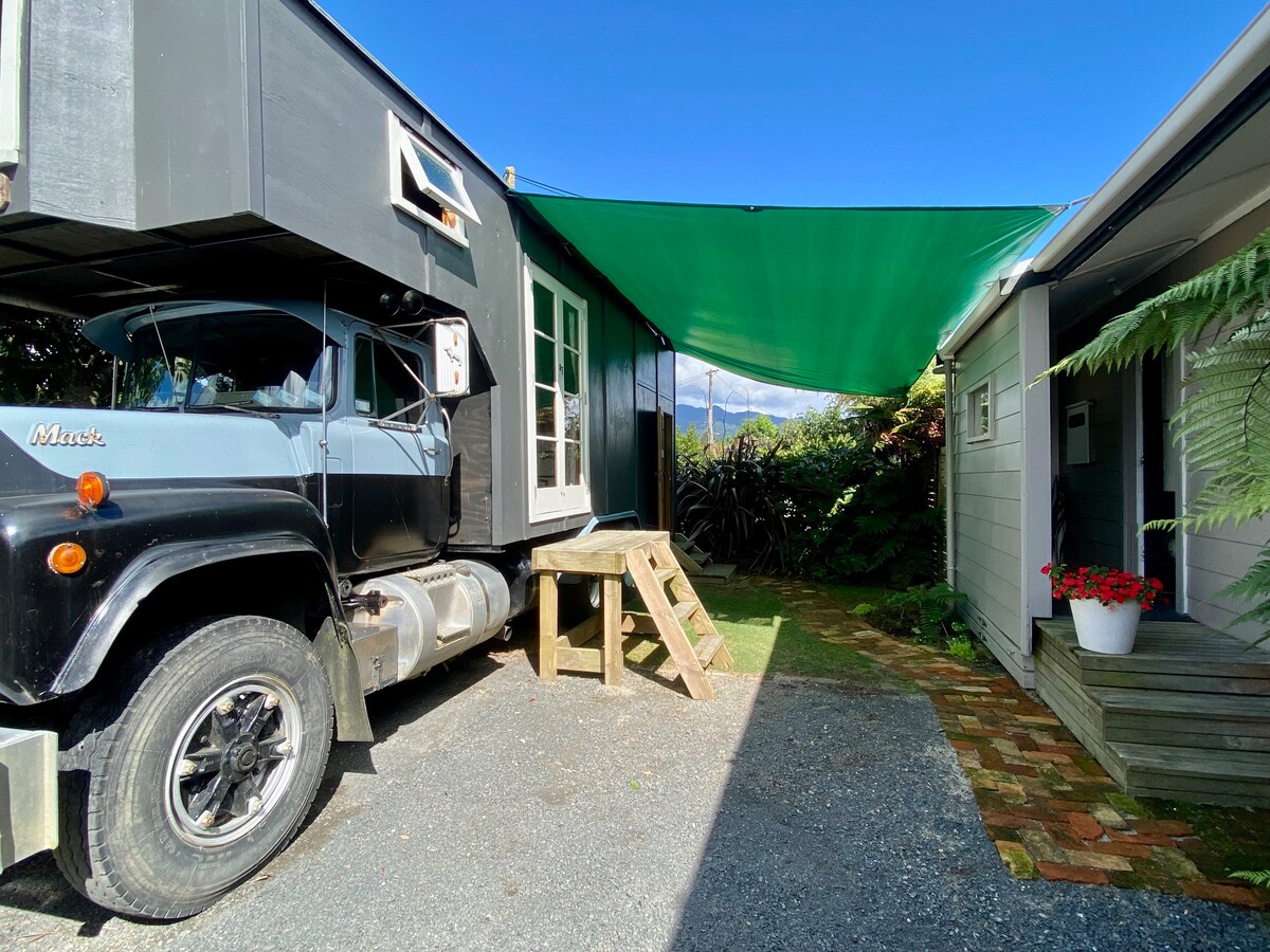 Stay in a Housetruck built from recycled/reused materials on the back of a Mack Truck. A Queen bed in the front loft and one single bed in the back. The Housetruck has basic kitchen facilities. Jug, toaster, fridge and microwave. A shower inside the truck, it runs from a califont so is set to one temperature using one tap. Please note that the toilet is located in a separate building about ten steps away along with the washing machine. You have unlimited private access to these.