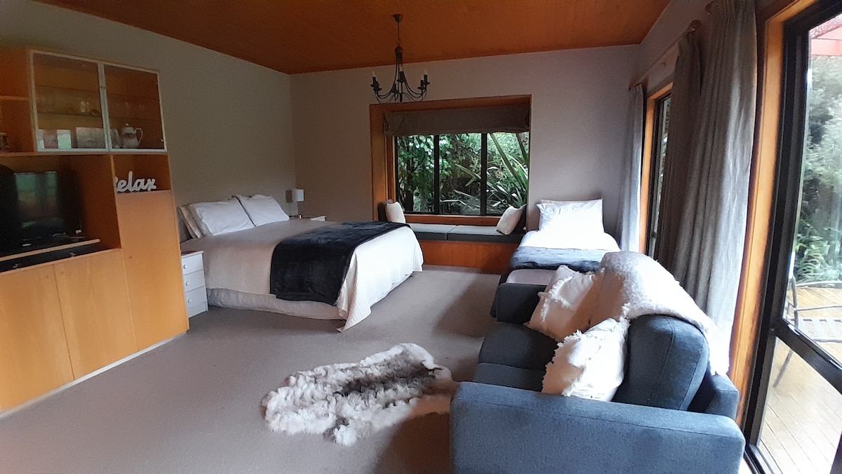 Beautiful and spacious guest suite with separate bathroom and private entrance. The main room has a king-size bed and a comfortable lounge area with a TV, coffee/tea/breakfast-making facilities and a dining area. The second room has two single beds. The bathroom is large and modern. There is a small covered outdoor deck with rural views to neighbouring farms and there is ample parking for cars/trailers/campervans. Continental breakfast is complimentary for stays of two nights or more.