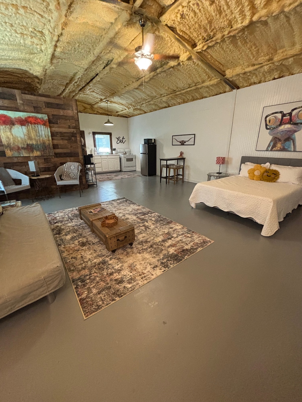Step into the Sleepy Eye Inn, a transformed grain silo in the heart of Hamilton, Texas. This one-of-a-kind retreat blends rustic charm with modern comfort, featuring reclaimed wood, vintage decor, and cozy touches. Enjoy a fully equipped kitchenette with a retro red fridge, a luxurious king bed, spacious bathroom with a clawfoot tub, and eclectic details throughout. Centrally located, you're just minutes from Circle T, dining, shopping, and attractions!! An unforgettable Texas getaway!
