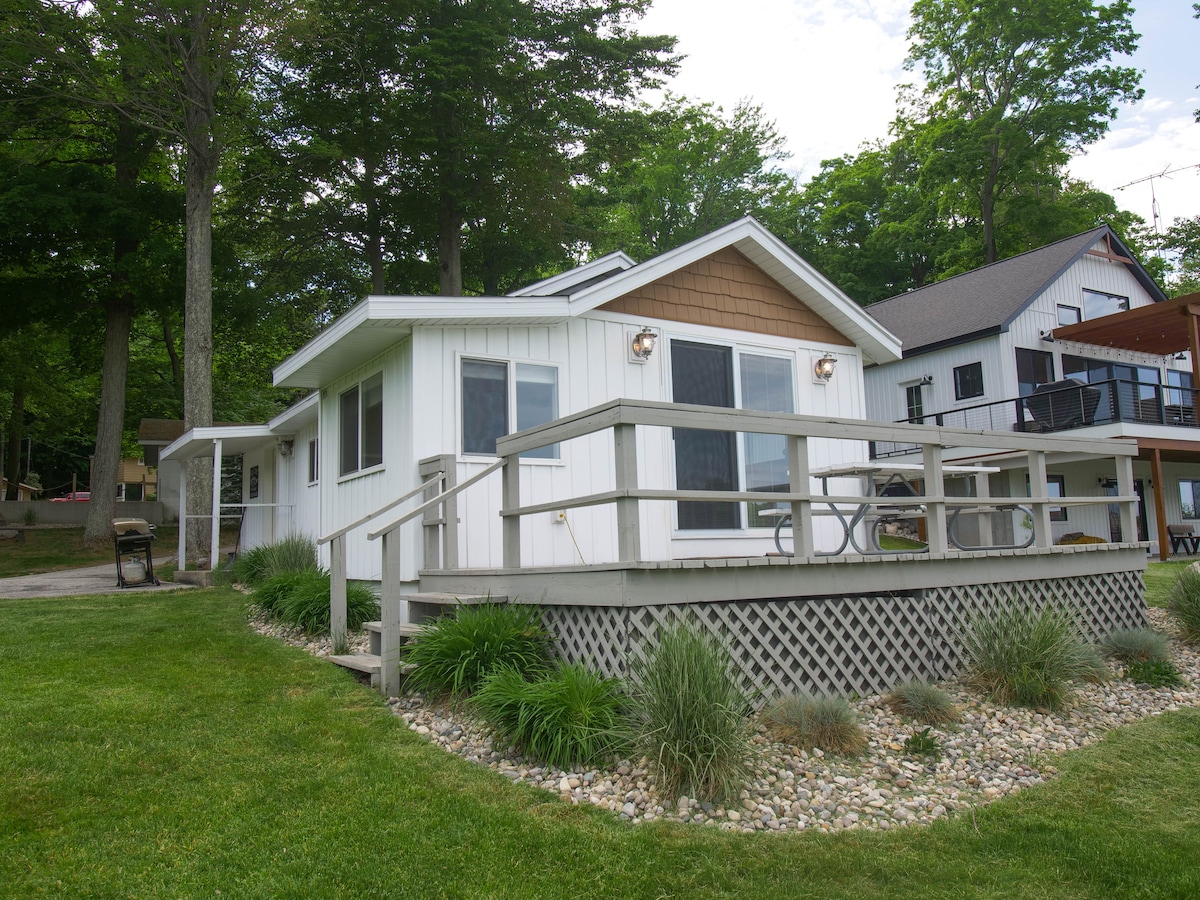 This charming cottage on the south bayou of Hamlin Lake is the perfect retreat for small families, couples, or friends looking to make memories. Spend your days taking kayaks or paddle boards out, relaxing in the hammock, or hiking at Ludington State Park, just a few miles away. In cooler months, curl up with a cup of cocoa in front of the electric fireplace and sink into the heated beds. Wind down the evening by the fire pit, under the stars, while overlooking the tranquil bayou.