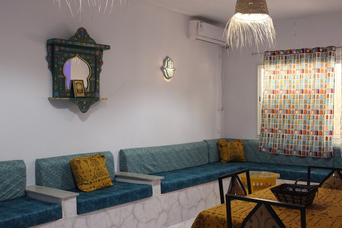 A seulement 100 m de la plage cette petite villa est parfaite pour profiter du cadre naturel et authentique joliment equipee pour offrir un maximum de confort un endroit calme pour vos vacances en famille ou entre amis logement situe au alentour de la site punique de kerkoune et a 13 km de de hawaria entierement independant et dipose de son propre jardin vert et terrasse et offrant une vrai therapie pour vos sens avec la paix