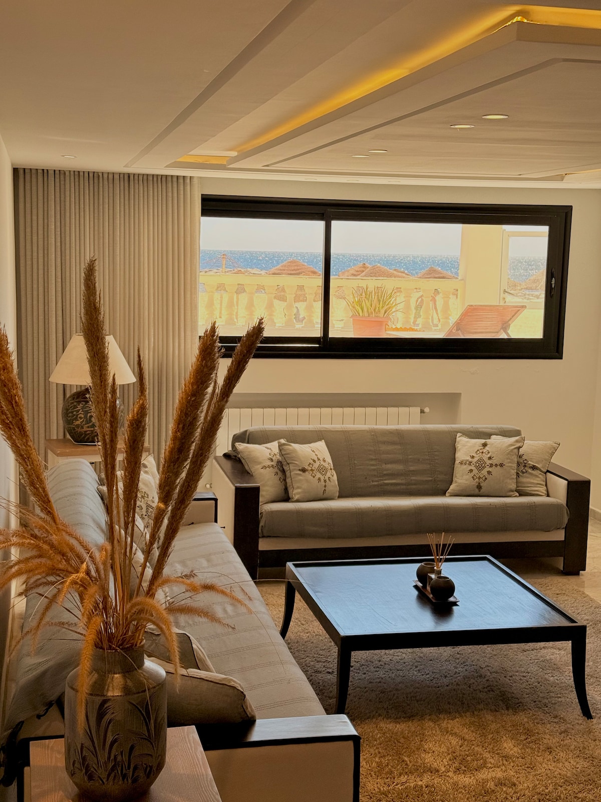 Discover this elegant and spacious apartment offering a truly breathtaking sea view from every angle. Thoughtfully decorated with a modern touch, it features a fully equipped kitchen ideal for long or short stays. Nestled in the heart of Sousse’s lively touristic zone, you’ll be close to beaches, cafés, and shops. Located peacefully on the top floor with no neighbors on the same level, it guarantees privacy, serenity, and an unforgettable stay.