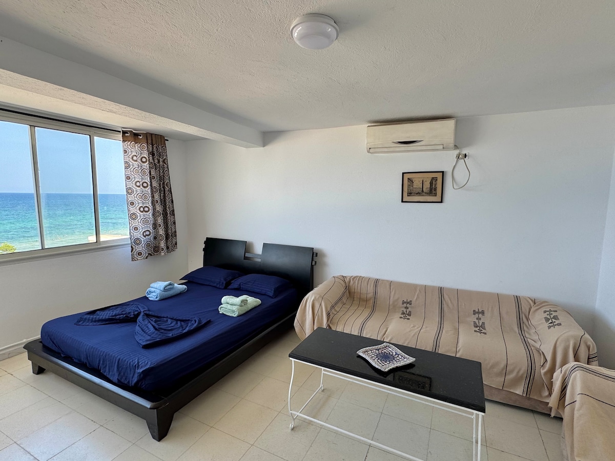 🌊 Enjoy uninterrupted sea views from this bright, one-room studio with a spacious rooftop terrace. 🏢 Fully furnished with A/C and a private water tank, ensuring water during local supply cuts. 📍 Located in a peaceful residential area across from the beach, a short walk to shops, cafés, and attractions. Just 5 minutes drive to Port El Kantaoui and the city center, and 30 minutes from Enfidha Airport. 📅 Book now for a relaxing seaside stay!