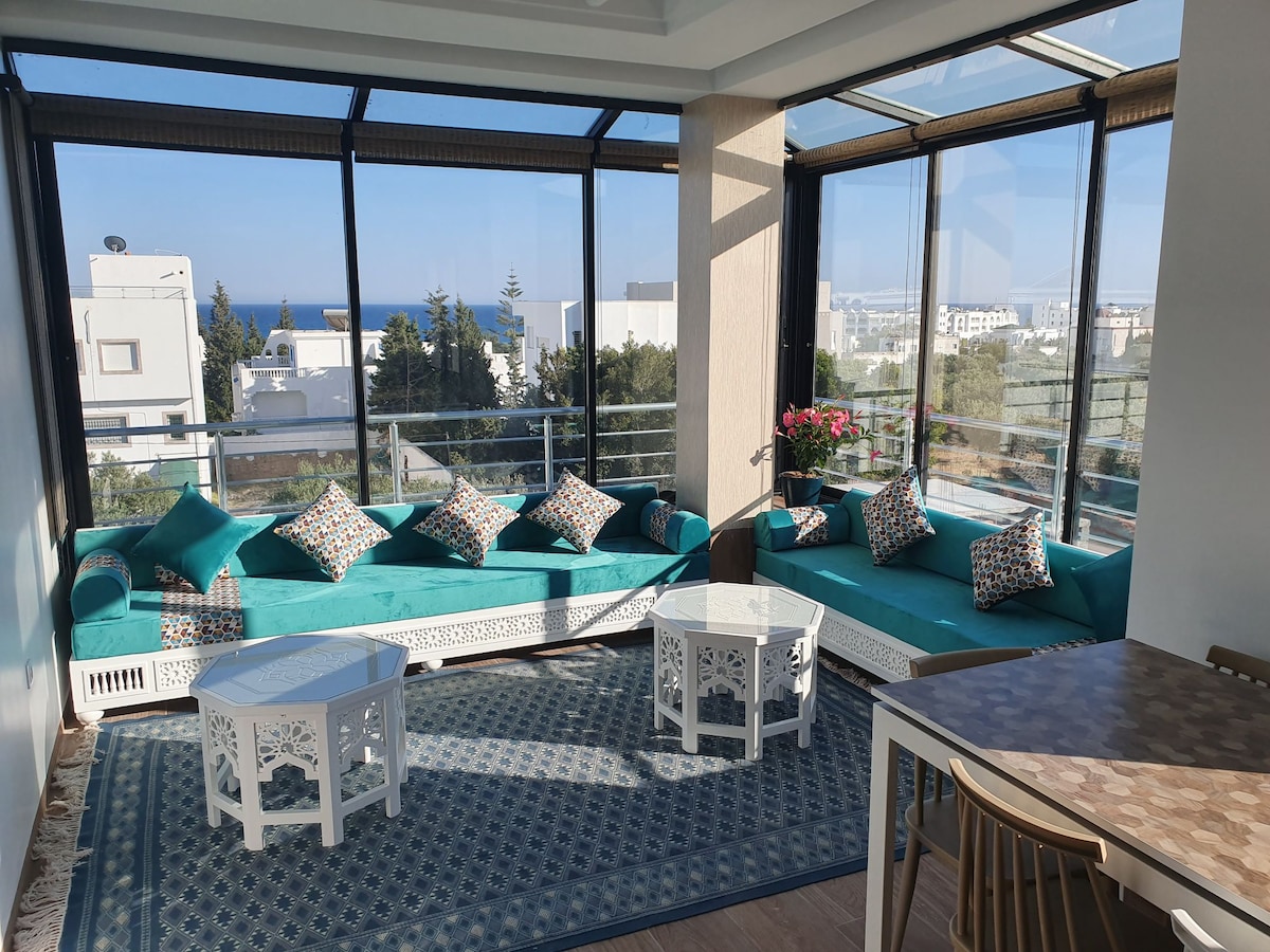 Ce logement paisible offre un séjour détente pour toute la famille. Sa localisation à cité El Wafa Mrezga Hammamet Nord lui met en avant pour sa proximité de la plage sidi Mahersi 5 min à pied et de sa proximité de toutes les commodités (fast food tunisiens, restaurant, Anouar Market, coffee shop, etc). L’appartement est équipé de 2 télés, 2climatiseurs, four, lave linge, sèche-linge, cafetière, batterie de cuisine pour faire des plats etc avec accès piscine partagé et parking voiture gratuit.