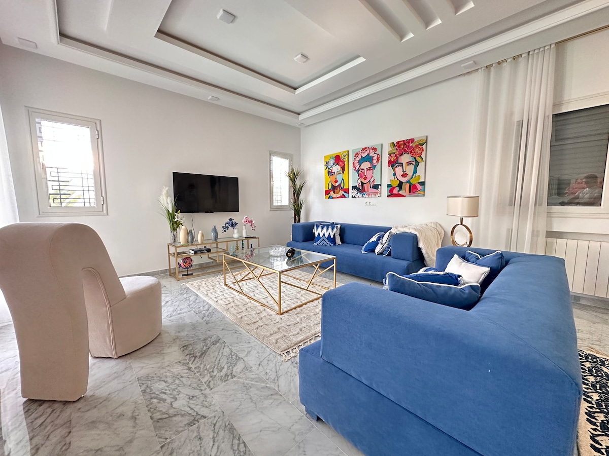 NO CLEANING FEES, our purpose is to make you feel home. Comfortable and spacious house with a big terrace ,a well equipped kitchen , 2 bathrooms with 1 bathtub and a private parking spot. It’s located in a very attractive and touristic area. 10 mn max by feet to get to the one of the best beach spots in Hammamet. You’ll find a variety of supermarkets, restaurants, cafés… just by walking. 3 ACs( 2 in the bedrooms and 1 in the living room). Central heating. Smart TV with free access to NETFLIX.