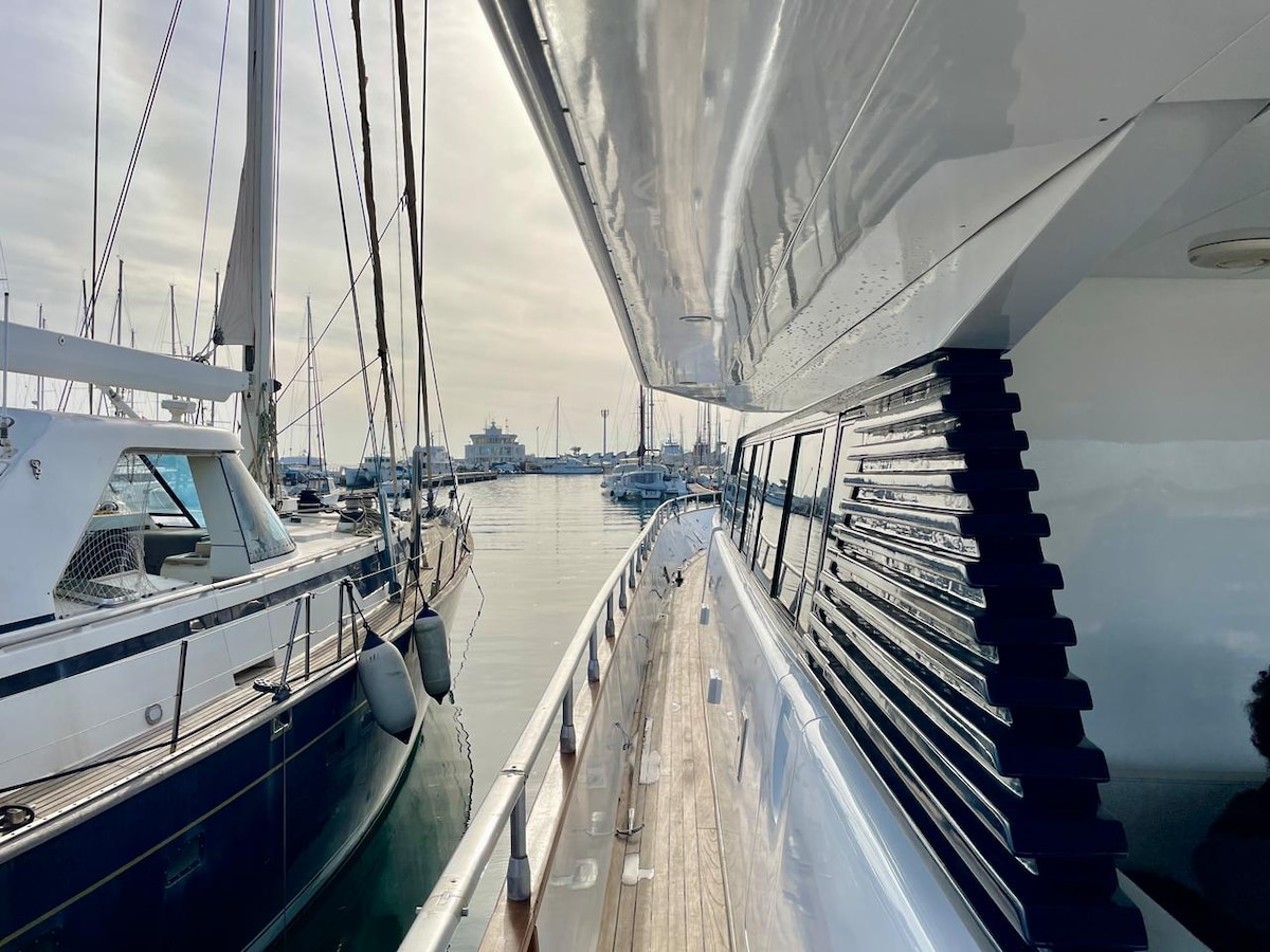 Ce logement mémorable est tout sauf ordinaire. Passer une nuit ou plus , en couple ou en groupe dans un magnifique yacht de 27 mètres dans le port de HAmmamet. Salon , salle a manger, cuisine , deux grandes terrasses , 4 suites chacune avec salle de bain Chauffage Climatisation Wifi Télé câble avec Netflix Cuisine équipée : micro ondes réfrigérateur cafetière filtre et cafetière Nespresso four et plaque de cuisson Petit déjeuner inclus